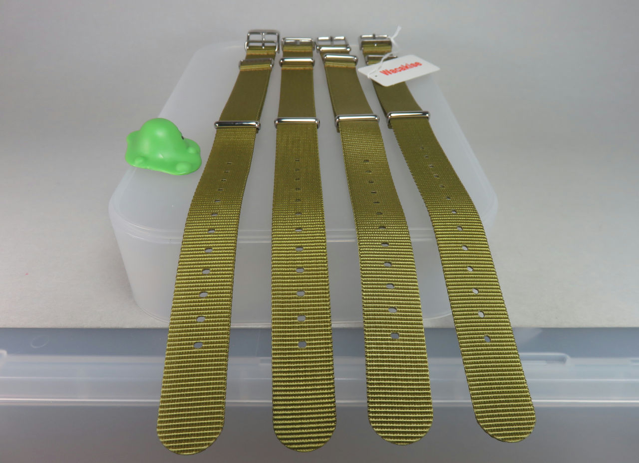 amazonマーケットプレイスで販売されている時計用ベルトの、通称NATOベルトで1000円以下のカーキ系の商品を何点か購入したので、参考までに写真を置いときます。