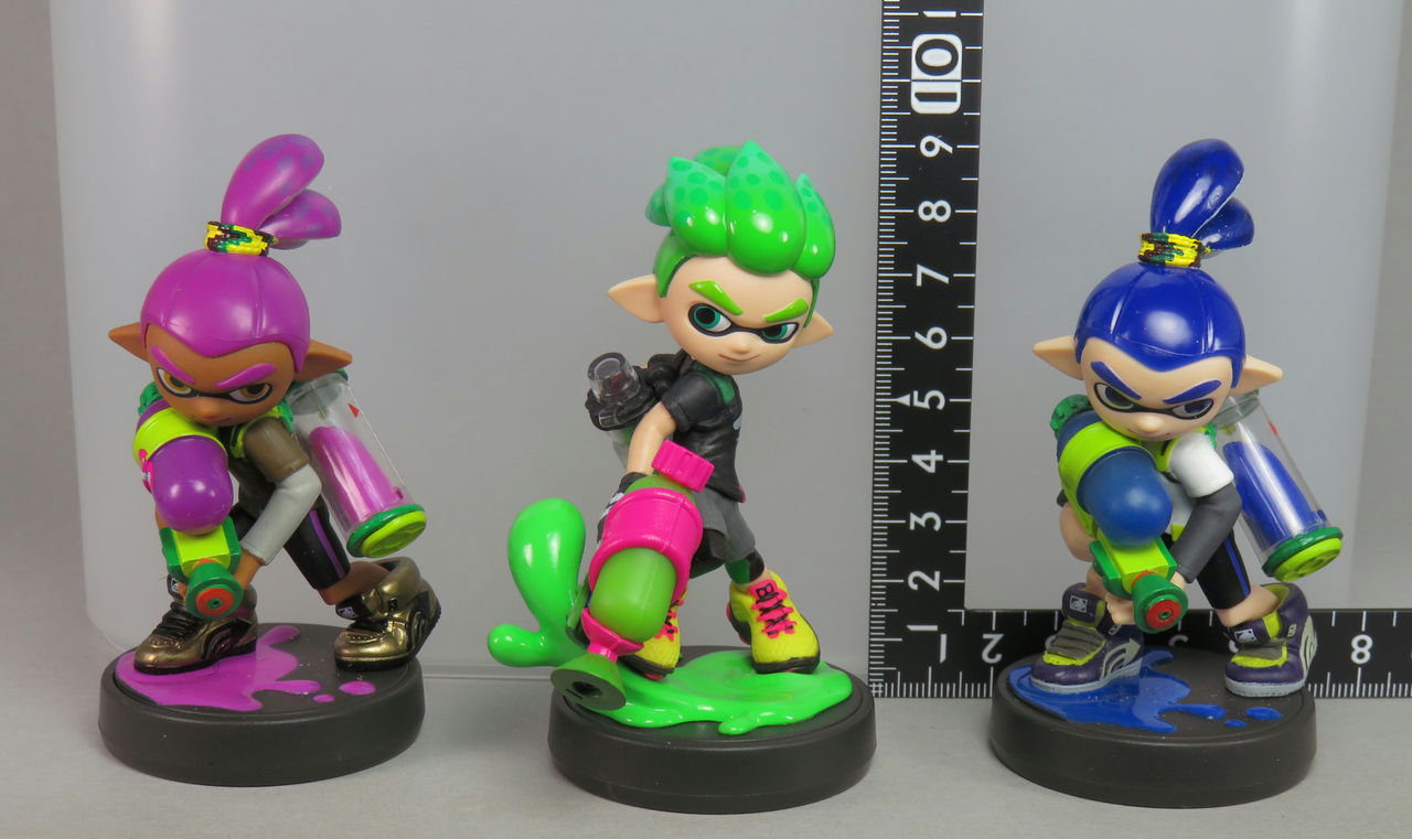 amiibo ガール【ネオンピンク】、amiibo ボーイ【ネオングリーン】、amiibo イカ【ネオンパープル】、